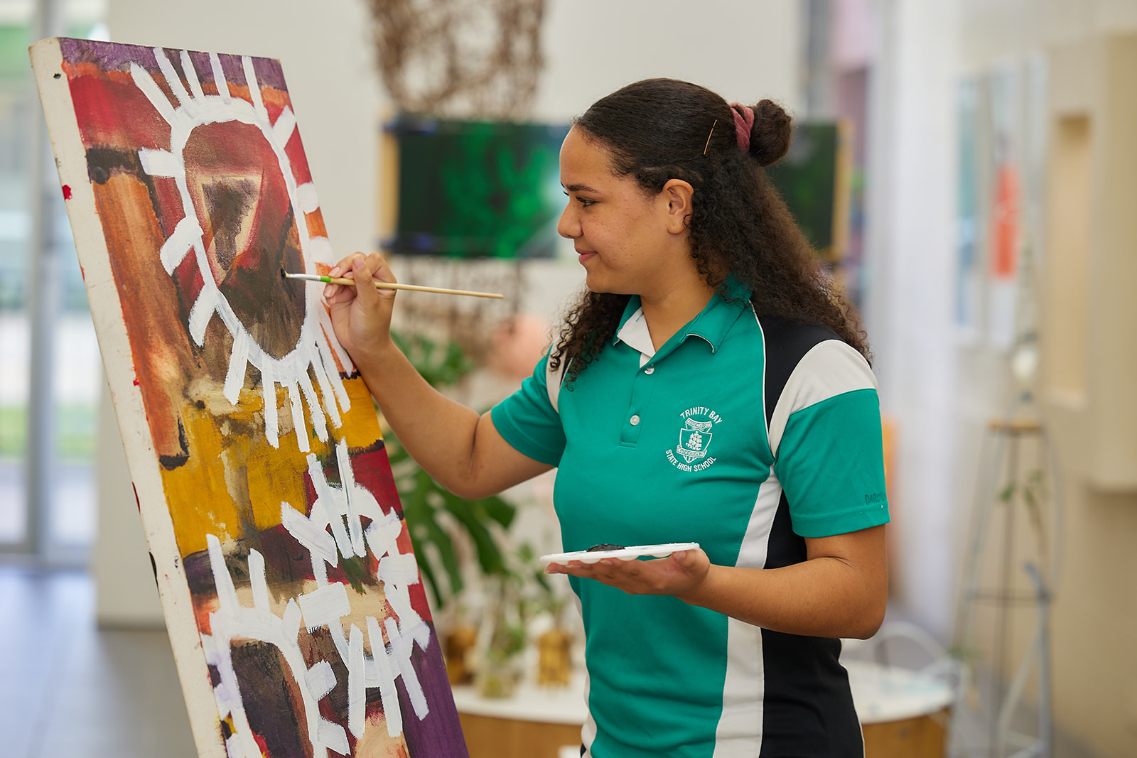 Trinity Bay State High School has a showcase visual arts department with programs and facilities which are amongst the best in Queensland. We have a dynamic team of staff who have a passion for and specialise in painting, drawing, ceramics, photography, printmaking, film and television and multi-media studies. Students regularly win acclaim state wide for the outstanding and highly professional work they produce. There is an emphasis on traditional media but we are unique in the way our visual arts staff integrate technology and new media into the concepts that students investigate from years 7 to 12.